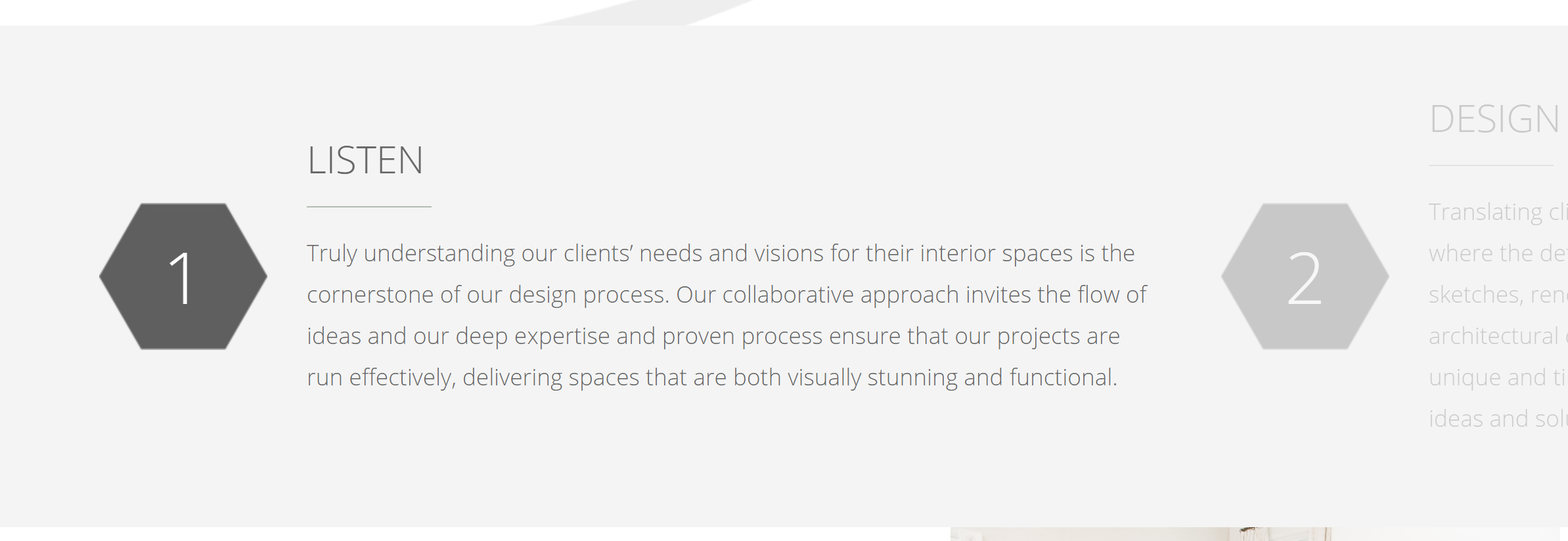 Once the final design guidelines and style guide were passed to Redline, we immediately began development. The first step in the web development process was the creation of the design using HTML5, CSS3, and JavaScript. Custom interactions were implemented to complement the design, such as a scrolling carousel for the multiple steps of the Daher Interior Design process, or the dynamic filtering of their project work.